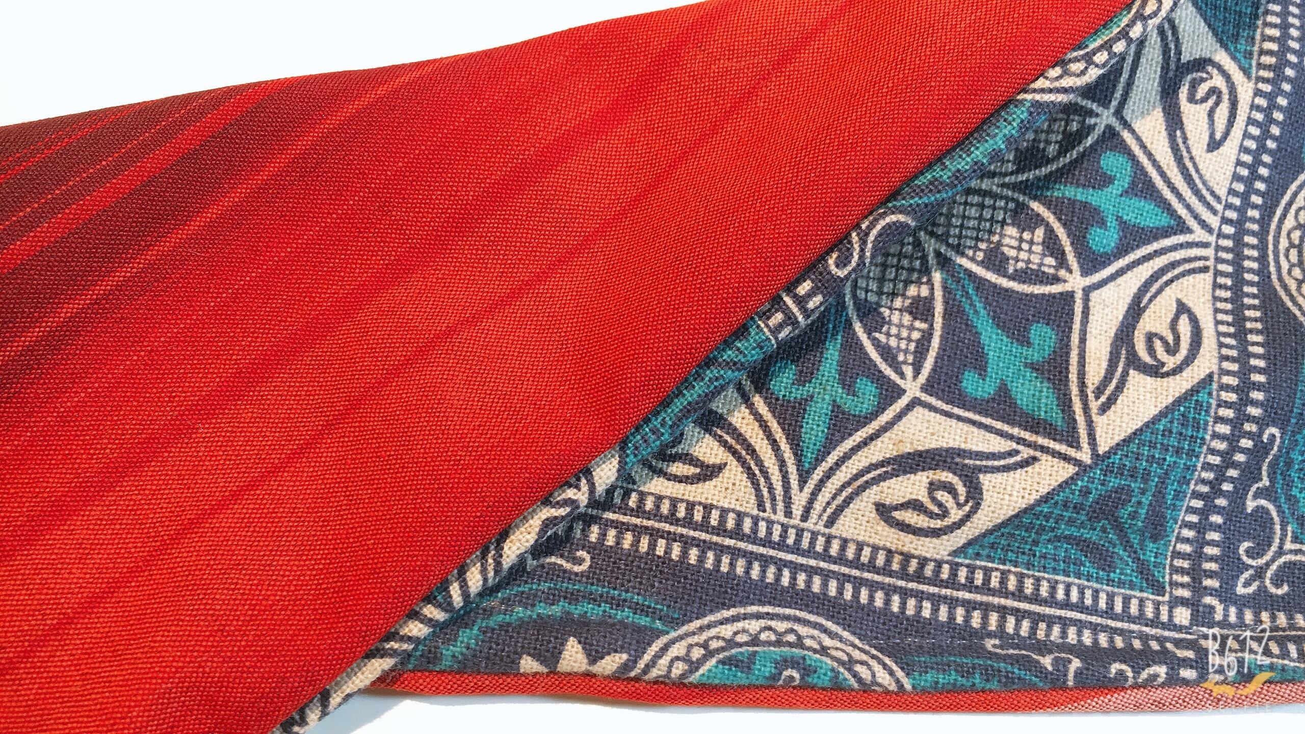 青を基調とした目を引く大きめのデザインのコットン生地と、赤を基調とした着物生地。