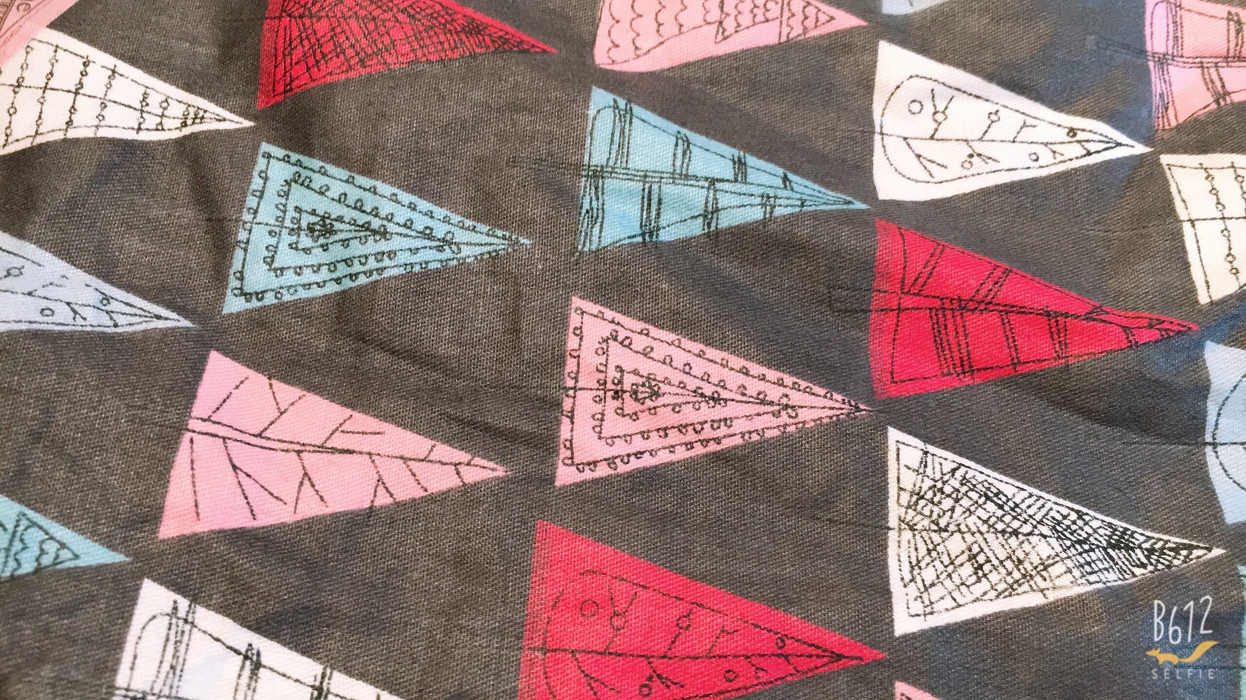 落ち着いた色味の中に可愛い三角形がたくさん並んだ生地を組み合わせました。