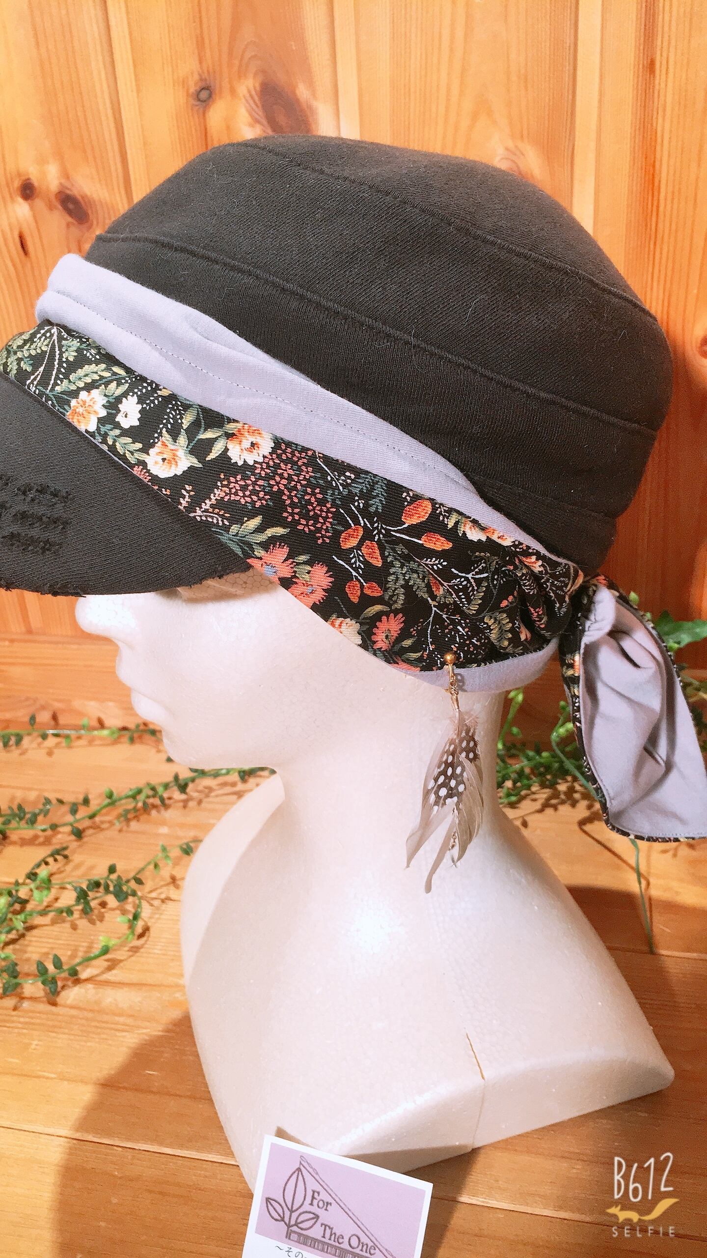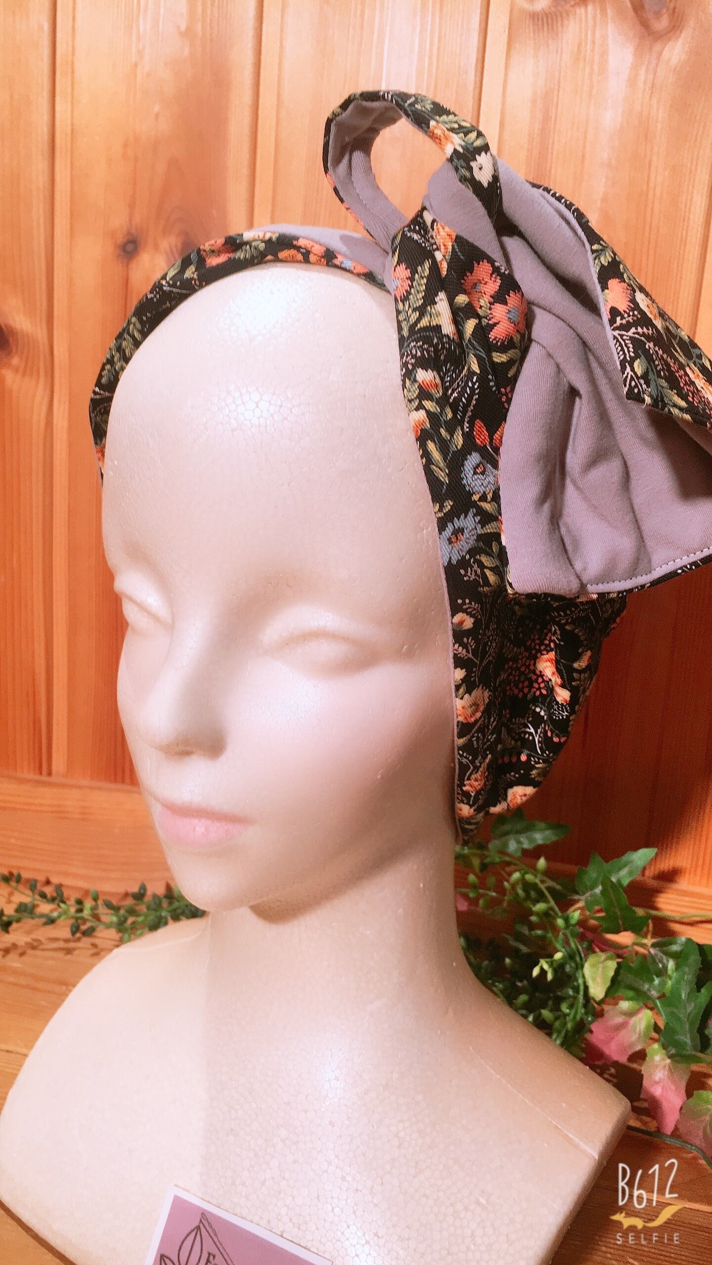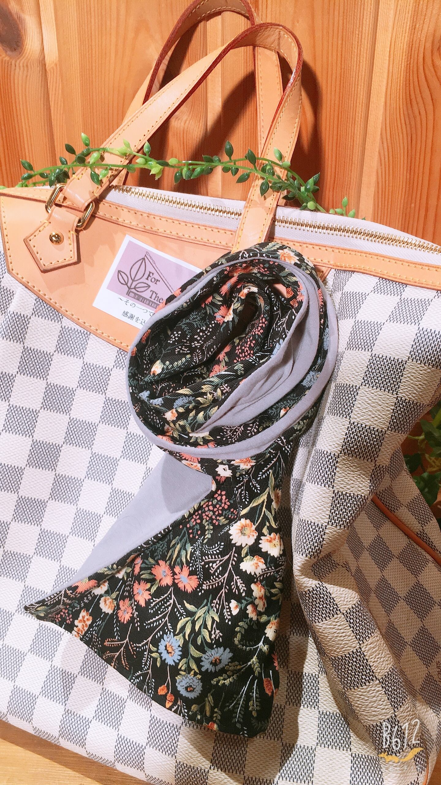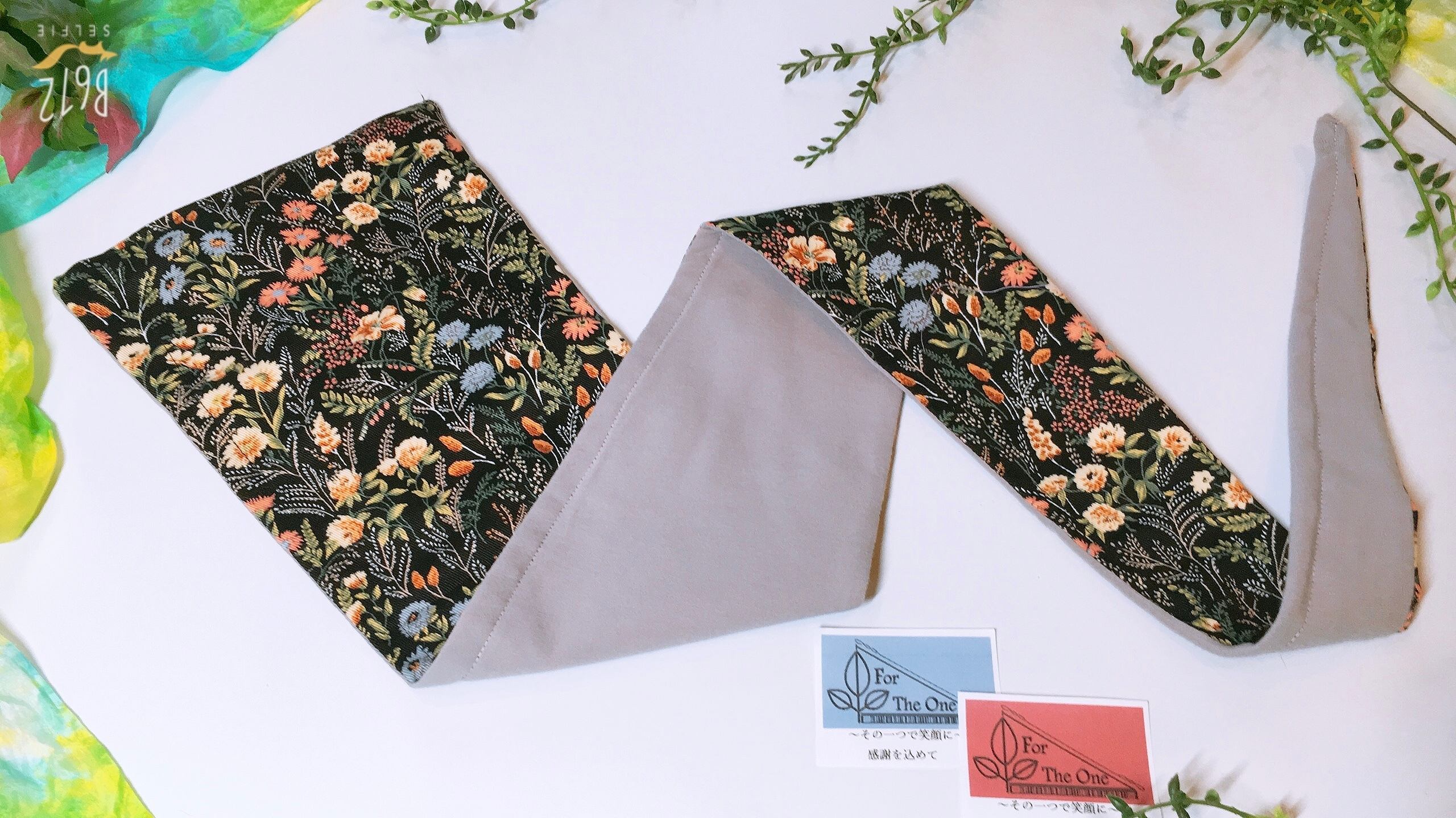 黒地に散りばめられた色とりどりの花たち♪ そして、明るめの優しいグレーの組み合わせです。子供から大人まで、男性のかたも、帽子に巻いたり、様々な場所で個性を引き立たせるアイテムとして活躍しますよ(^▽^)/